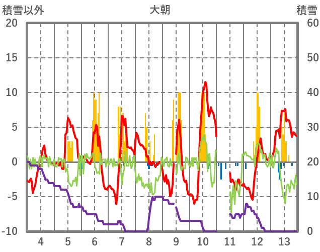 | 日 | 時 | 気温 | 降水 | 風向/風速 | 日照 | 積雪 | 降雪 |