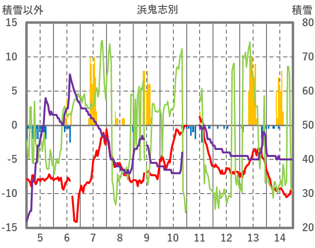 | 日 | 時 | 気温 | 降水 | 風向/風速 | 日照 | 積雪 | 降雪 |