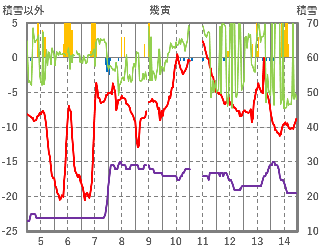 | 日 | 時 | 気温 | 降水 | 風向/風速 | 日照 | 積雪 | 降雪 |