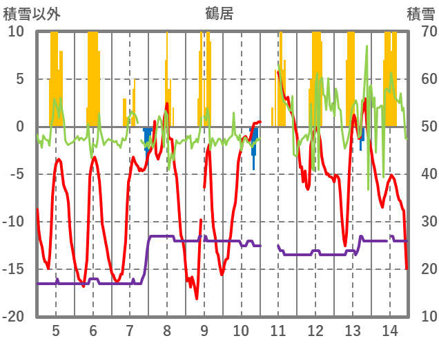 | 日 | 時 | 気温 | 降水 | 風向/風速 | 日照 | 積雪 | 降雪 |