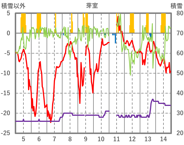 | 日 | 時 | 気温 | 降水 | 風向/風速 | 日照 | 積雪 | 降雪 |