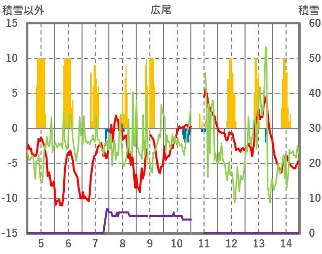 | 日 | 時 | 気温 | 降水 | 風向/風速 | 日照 | 積雪 | 降雪 |