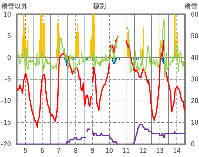| 日 | 時 | 気温 | 降水 | 風向/風速 | 日照 | 積雪 | 降雪 |