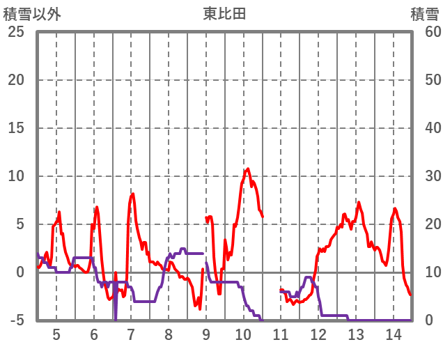 | 日 | 時 | 気温 | 降水 | 風向/風速 | 日照 | 積雪 | 降雪 |