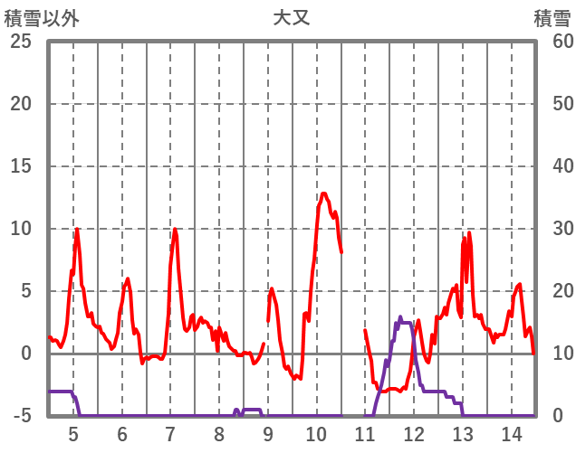 | 日 | 時 | 気温 | 降水 | 風向/風速 | 日照 | 積雪 | 降雪 |