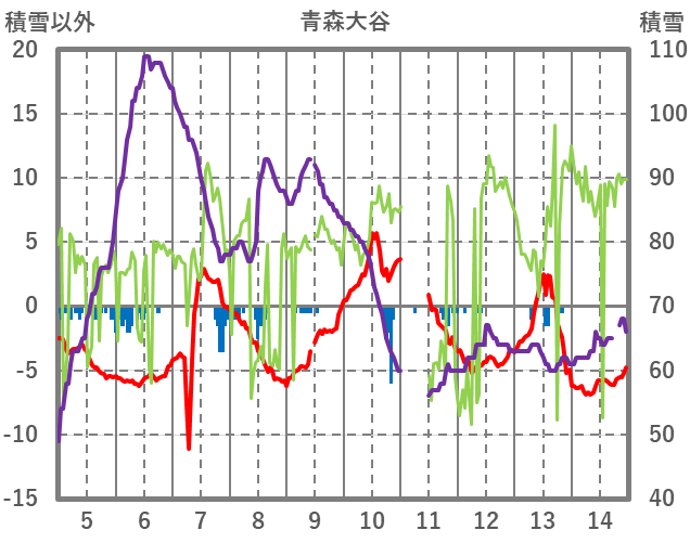 | 日 | 時 | 気温 | 降水 | 風向/風速 | 日照 | 積雪 | 降雪 |