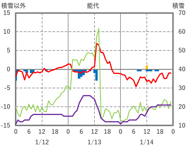 | 日 | 時 | 気温 | 降水 | 風向/風速 | 日照 | 積雪 | 降雪 |