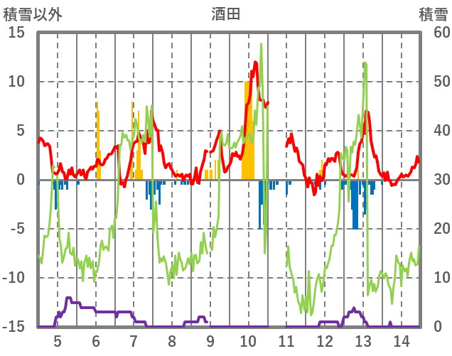| 日 | 時 | 気温 | 降水 | 風向/風速 | 日照 | 積雪 | 降雪 |