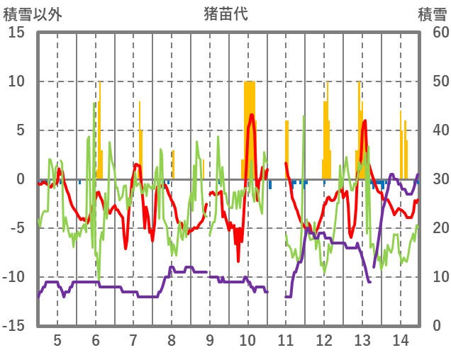 | 日 | 時 | 気温 | 降水 | 風向/風速 | 日照 | 積雪 | 降雪 |