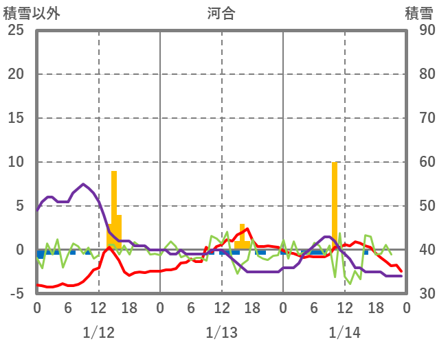 | 日 | 時 | 気温 | 降水 | 風向/風速 | 日照 | 積雪 | 降雪 |