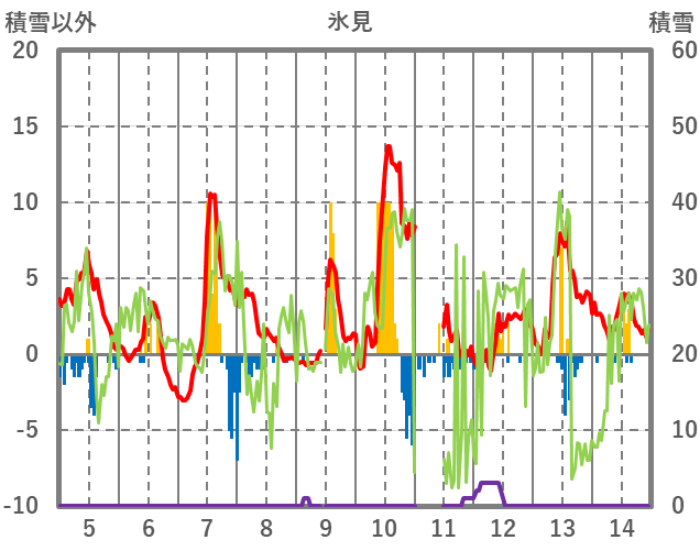 | 日 | 時 | 気温 | 降水 | 風向/風速 | 日照 | 積雪 | 降雪 |