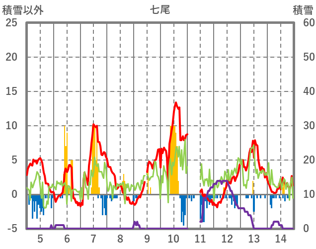 | 日 | 時 | 気温 | 降水 | 風向/風速 | 日照 | 積雪 | 降雪 |