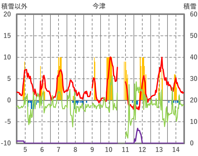 | 日 | 時 | 気温 | 降水 | 風向/風速 | 日照 | 積雪 | 降雪 |