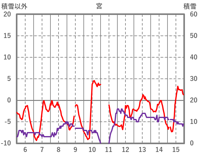 | 日 | 時 | 気温 | 降水 | 風向/風速 | 日照 | 積雪 | 降雪 |