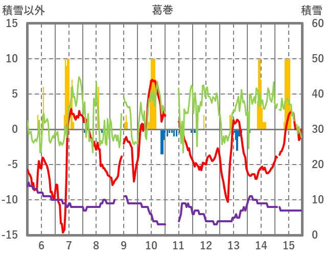 | 日 | 時 | 気温 | 降水 | 風向/風速 | 日照 | 積雪 | 降雪 |