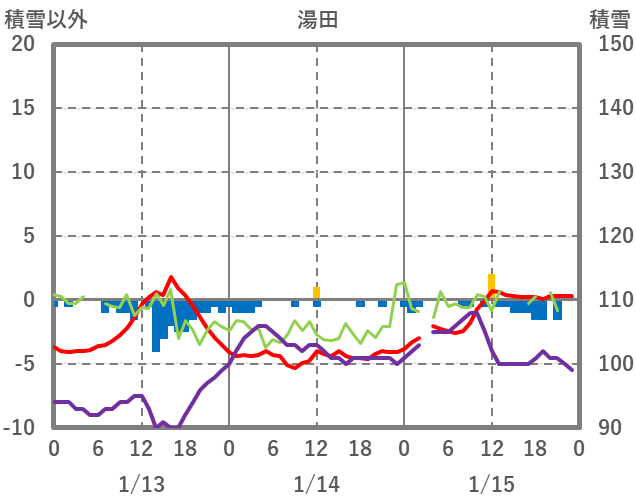 | 日 | 時 | 気温 | 降水 | 風向/風速 | 日照 | 積雪 | 降雪 |