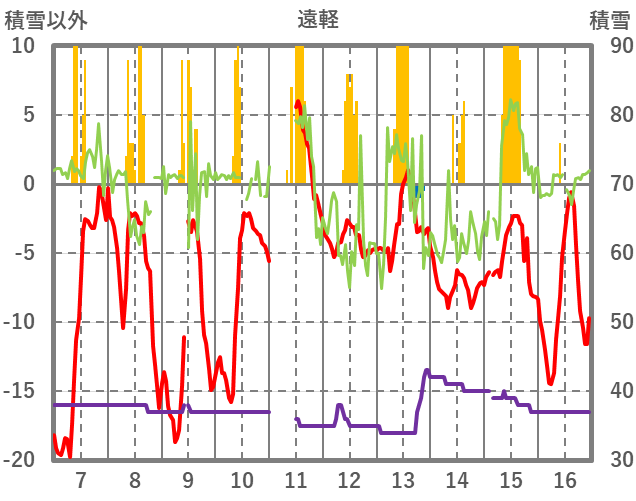 | 日 | 時 | 気温 | 降水 | 風向/風速 | 日照 | 積雪 | 降雪 |