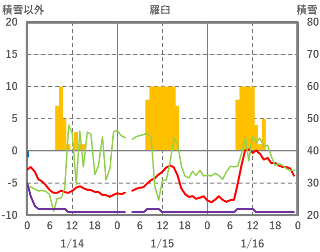 | 日 | 時 | 気温 | 降水 | 風向/風速 | 日照 | 積雪 | 降雪 |