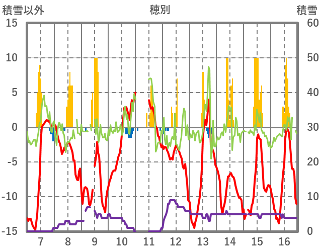 | 日 | 時 | 気温 | 降水 | 風向/風速 | 日照 | 積雪 | 降雪 |