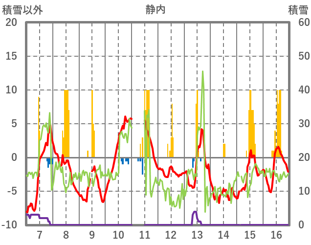 | 日 | 時 | 気温 | 降水 | 風向/風速 | 日照 | 積雪 | 降雪 |