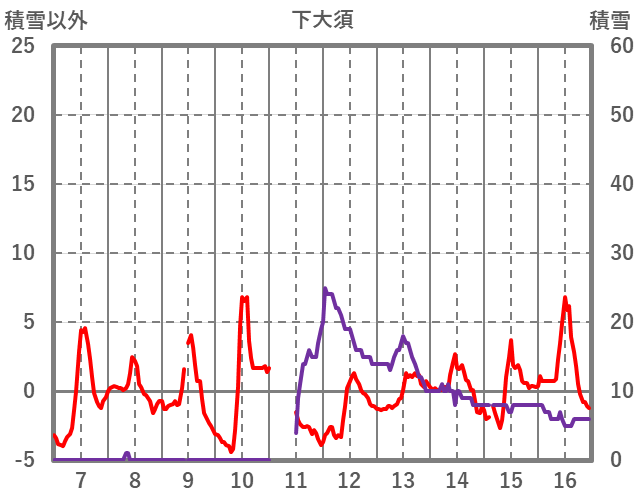 | 日 | 時 | 気温 | 降水 | 風向/風速 | 日照 | 積雪 | 降雪 |