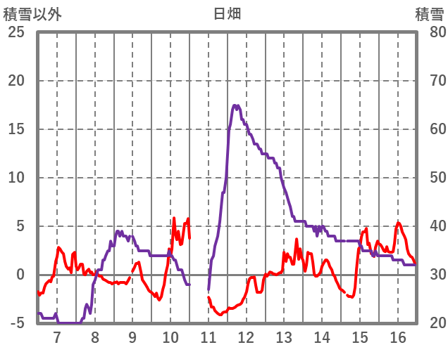 | 日 | 時 | 気温 | 降水 | 風向/風速 | 日照 | 積雪 | 降雪 |