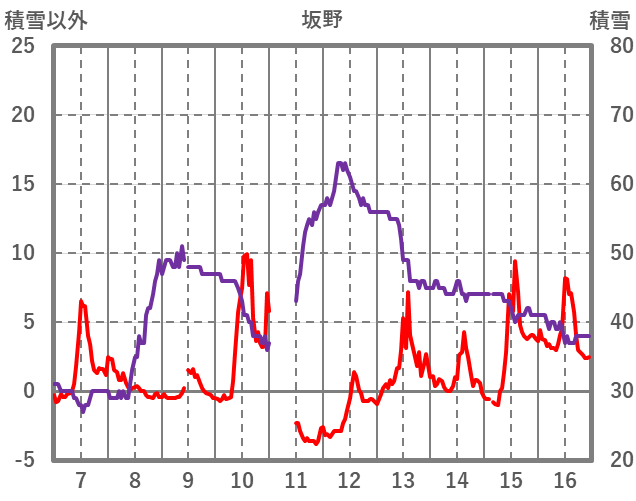 | 日 | 時 | 気温 | 降水 | 風向/風速 | 日照 | 積雪 | 降雪 |