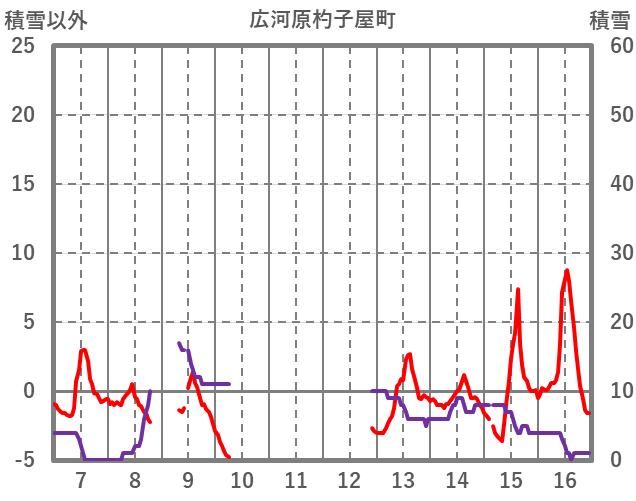 | 日 | 時 | 気温 | 降水 | 風向/風速 | 日照 | 積雪 | 降雪 |