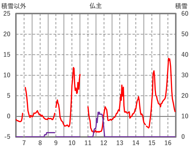 | 日 | 時 | 気温 | 降水 | 風向/風速 | 日照 | 積雪 | 降雪 |