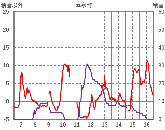 | 日 | 時 | 気温 | 降水 | 風向/風速 | 日照 | 積雪 | 降雪 |
