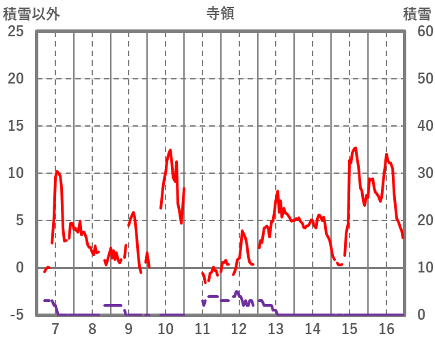 | 日 | 時 | 気温 | 降水 | 風向/風速 | 日照 | 積雪 | 降雪 |