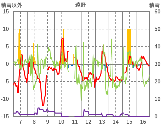 | 日 | 時 | 気温 | 降水 | 風向/風速 | 日照 | 積雪 | 降雪 |