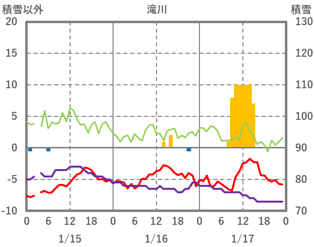 | 日 | 時 | 気温 | 降水 | 風向/風速 | 日照 | 積雪 | 降雪 |