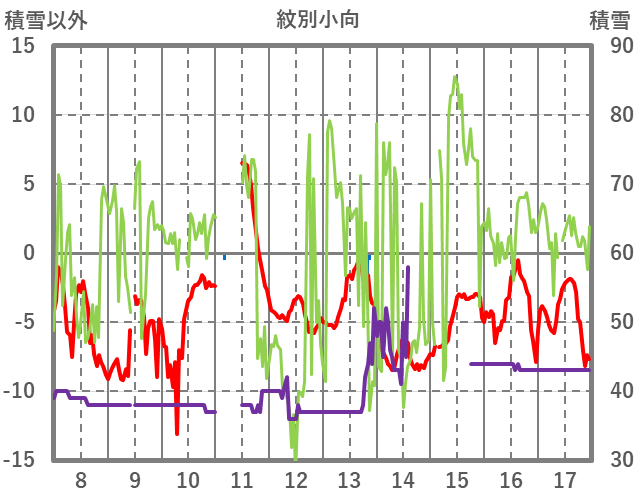 | 日 | 時 | 気温 | 降水 | 風向/風速 | 日照 | 積雪 | 降雪 |