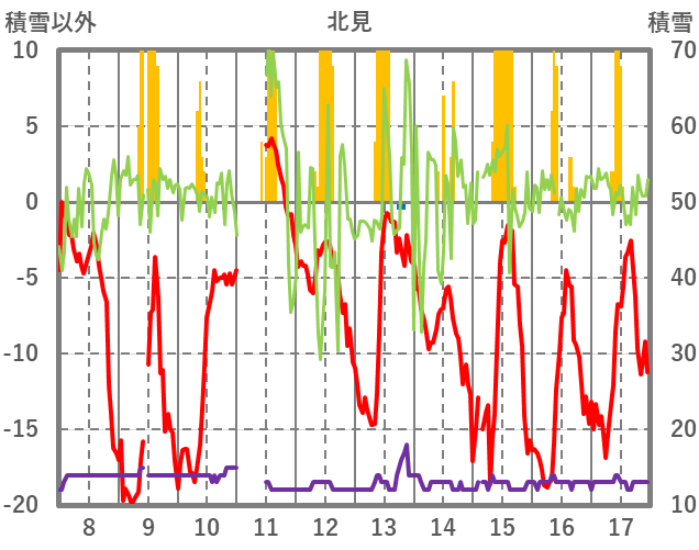 | 日 | 時 | 気温 | 降水 | 風向/風速 | 日照 | 積雪 | 降雪 |