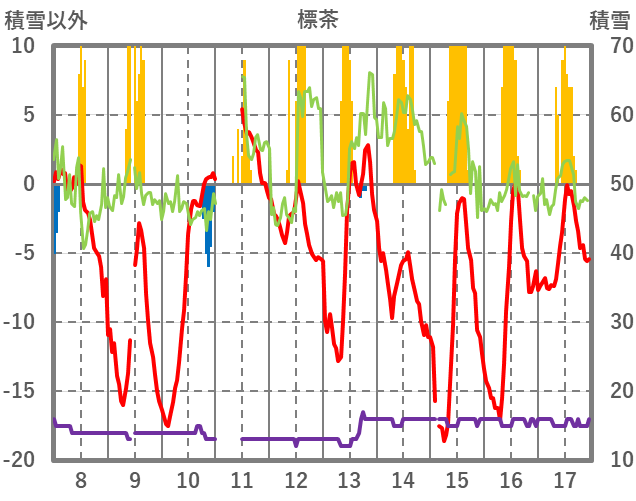 | 日 | 時 | 気温 | 降水 | 風向/風速 | 日照 | 積雪 | 降雪 |