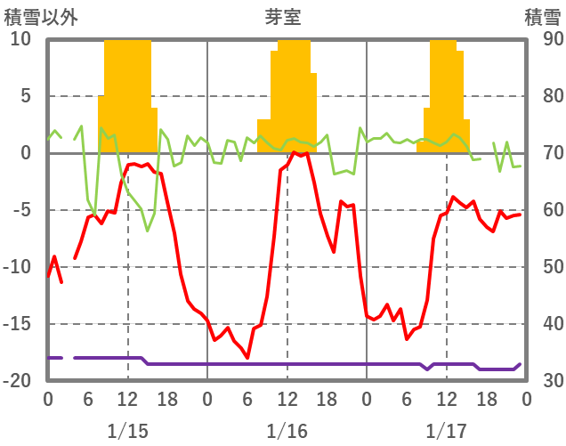 | 日 | 時 | 気温 | 降水 | 風向/風速 | 日照 | 積雪 | 降雪 |