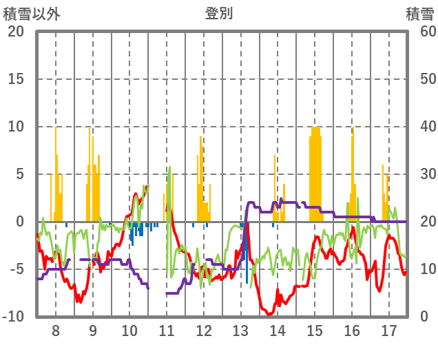 | 日 | 時 | 気温 | 降水 | 風向/風速 | 日照 | 積雪 | 降雪 |