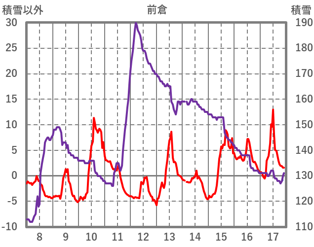 | 日 | 時 | 気温 | 降水 | 風向/風速 | 日照 | 積雪 | 降雪 |