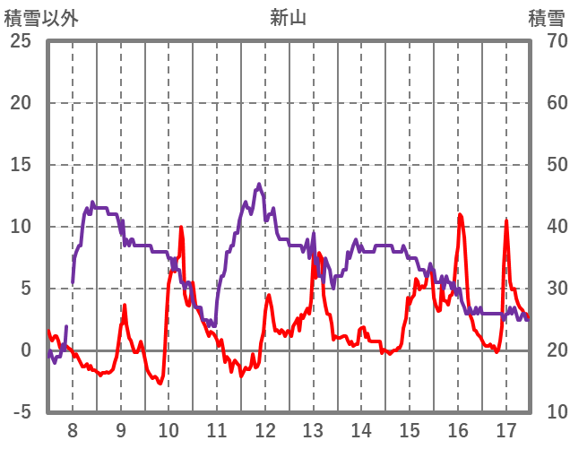 | 日 | 時 | 気温 | 降水 | 風向/風速 | 日照 | 積雪 | 降雪 |