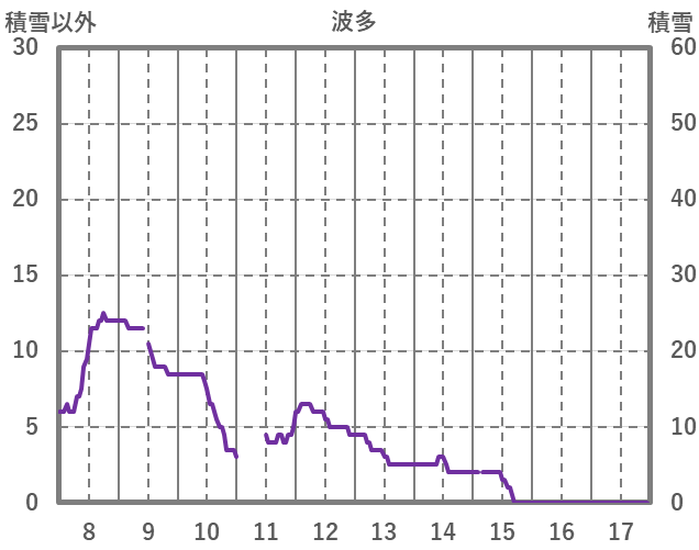 | 日 | 時 | 気温 | 降水 | 風向/風速 | 日照 | 積雪 | 降雪 |