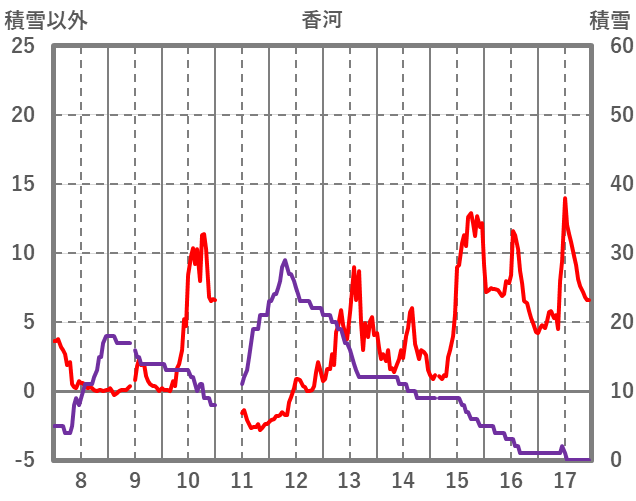 | 日 | 時 | 気温 | 降水 | 風向/風速 | 日照 | 積雪 | 降雪 |