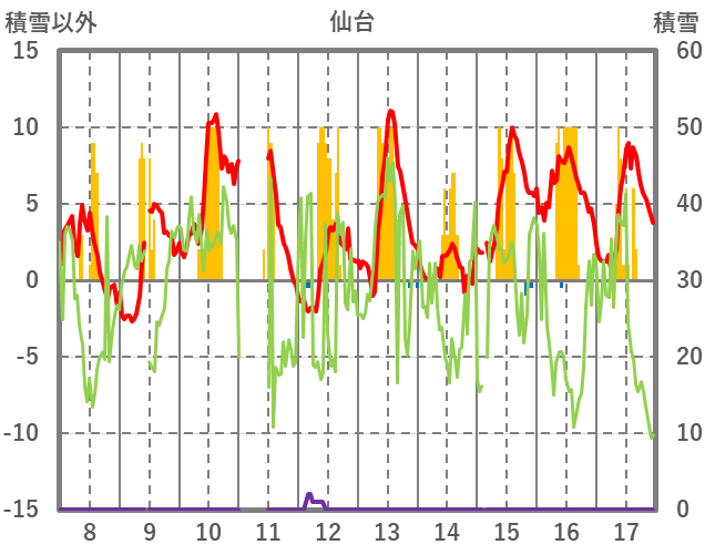 | 日 | 時 | 気温 | 降水 | 風向/風速 | 日照 | 積雪 | 降雪 |