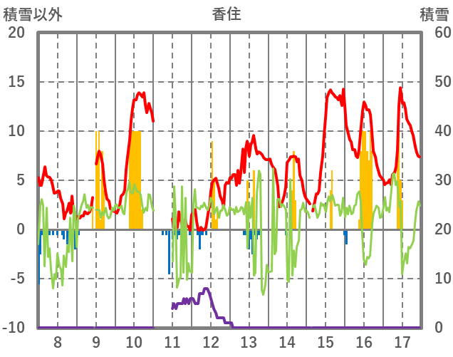 | 日 | 時 | 気温 | 降水 | 風向/風速 | 日照 | 積雪 | 降雪 |