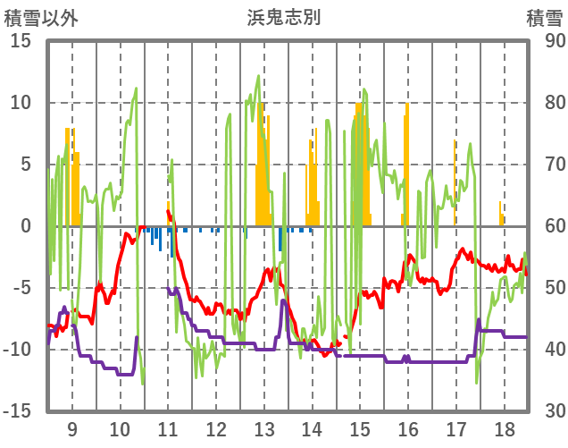 | 日 | 時 | 気温 | 降水 | 風向/風速 | 日照 | 積雪 | 降雪 |
