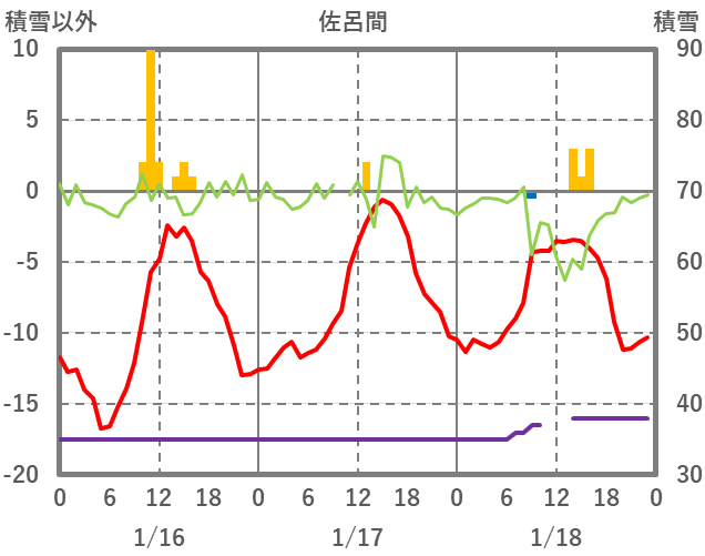 | 日 | 時 | 気温 | 降水 | 風向/風速 | 日照 | 積雪 | 降雪 |