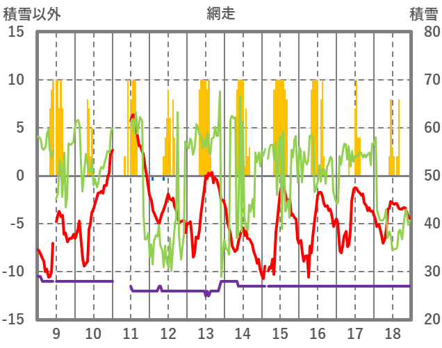 | 日 | 時 | 気温 | 降水 | 風向/風速 | 日照 | 積雪 | 降雪 |