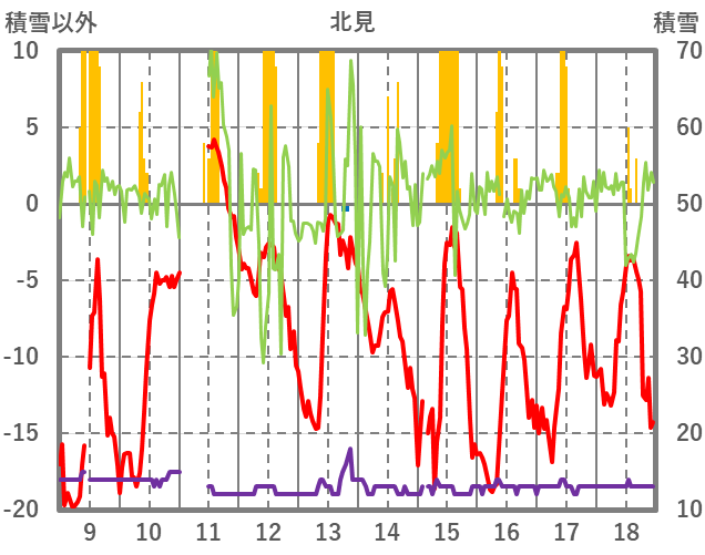 | 日 | 時 | 気温 | 降水 | 風向/風速 | 日照 | 積雪 | 降雪 |