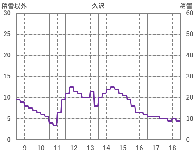 | 日 | 時 | 気温 | 降水 | 風向/風速 | 日照 | 積雪 | 降雪 |