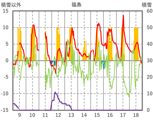 | 日 | 時 | 気温 | 降水 | 風向/風速 | 日照 | 積雪 | 降雪 |